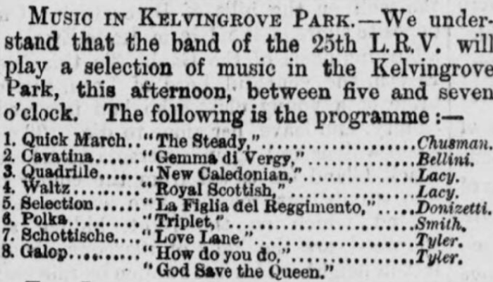At 5 o’clock on Saturday 3rd August 1872, the very first band played at Kelvingrove Park. These pioneers were the band of the 25th Lanarkshire Rifle Volunteers, a well-known local military band. In that very first concert they played a selection of popular classical and Scottish pieces which most of the crowd would have been very familiar with. It must have been a success because it started the tradition of live music in the park which is still going today, over 150 years and many thousands of musicians later!