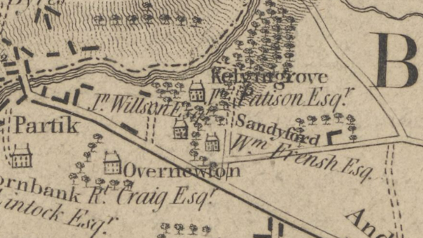 Just to the south was Kelvinbank House, and on the hills overlooking the river valley was Gilmorehill House (where the University stands today) and Woodlands House (where Park Circus is).