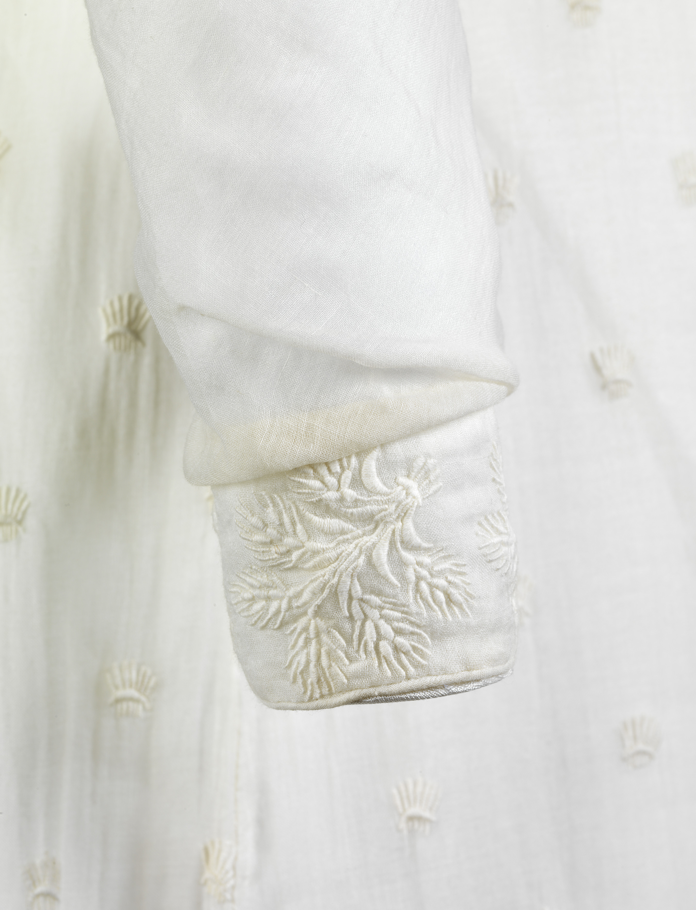 One of the most popular materials for these gowns was cotton, either a finely woven version known as muslin worn for evening wear or a slightly heavier weight cotton that was printed and used for day dresses. Cotton is a natural yarn made from the soft white fibres that grow in a ball around the seeds of the cotton plant Gossypium, native to the Indian subcontinent and parts of southern America. When cotton became fashionable in the 1770s the best cotton muslins were imported as woven cloth from Bengal, which had been annexed on behalf of Britain by the East India Company in 1765. However, by the late 1700s vast amounts of raw cotton was imported from the southern states of America and the West Indies. Many of these cotton plantations, especially those in the Caribbean, were owned or managed by Scots, with the cotton sewn and harvested by enslaved men, woman and children brought over from Africa as part of the transatlantic slave trade, or their descendants.